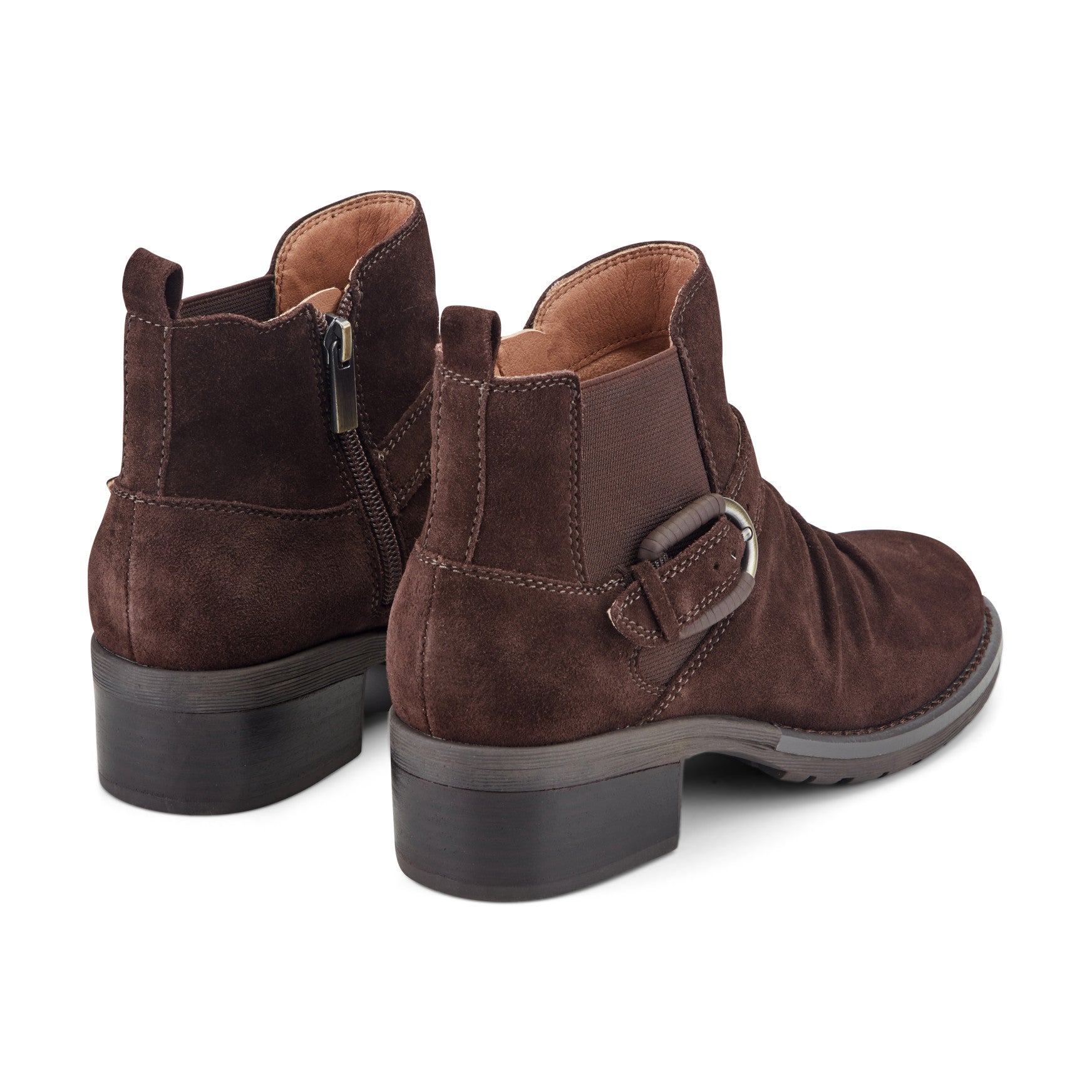 Side buckle strap adds refined style while the elastic gore ensures a comfortable fit.